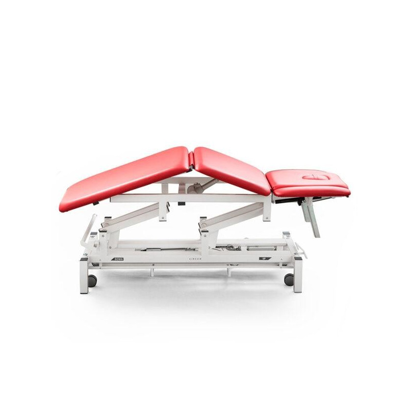 Professioneel driedelig bed met twee elektromotoren voor het verstellen van de hoogte en het middengedeelte en twee gaszuigers voor het verstellen van het beengedeelte en de hoofdsteun.